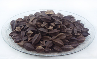本品為使君子科植物使君子Quisqualis indica L.的干燥成熟果實(shí)。秋季果皮變紫黑色時(shí)采收,除去雜質(zhì),干燥。【性狀】 本品呈橢圓形或卵圓形,具5條縱棱,偶有4~9棱,長(zhǎng)2.5~4cm,直徑約2cm。表面黑褐色至紫黑色,平滑,微具光澤。頂端狹尖,基部鈍圓,有明顯圓形的果梗痕。質(zhì)堅(jiān)硬,橫切面多呈五角星形,棱角處殼較厚,中間呈類圓形空腔。種子長(zhǎng)橢圓形或紡錘形,長(zhǎng)約2cm,直徑約lcm;表面棕褐色或黑褐色,有多數(shù)縱皺紋;種皮薄,易剝離;子葉2.黃白色,有油性,斷面有裂隙。氣微香,味微甜。
