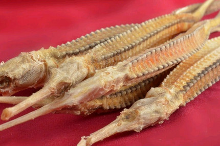 尖海龍:體細(xì)長,呈鞭狀,全長10~30cm,未去皮膜。表面黃褐色。有的腹面可見育兒囊,有尾鰭。質(zhì)較脆弱,易撕裂。
