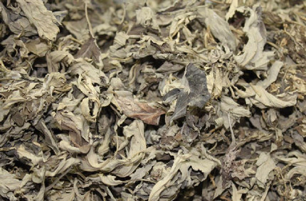 【性狀】本品多皺縮、破碎,有短柄。完整葉片展平后呈卵狀橢圓形,羽狀深裂,裂片橢圓狀披針形,邊緣有不規(guī)則的粗鋸齒,上表面灰綠色或深黃綠色,有稀疏的柔毛及腺點;下表面密生灰白色絨毛。質(zhì)柔軟。氣清香,味苦。